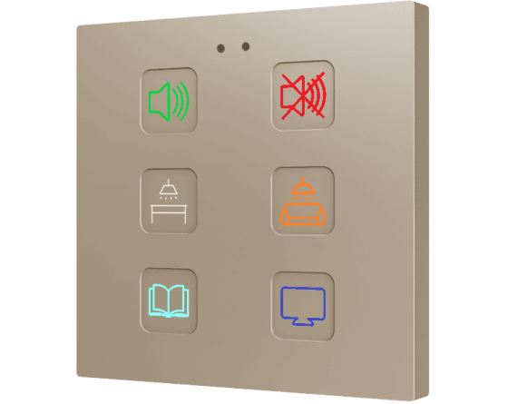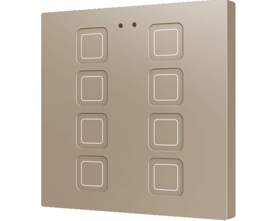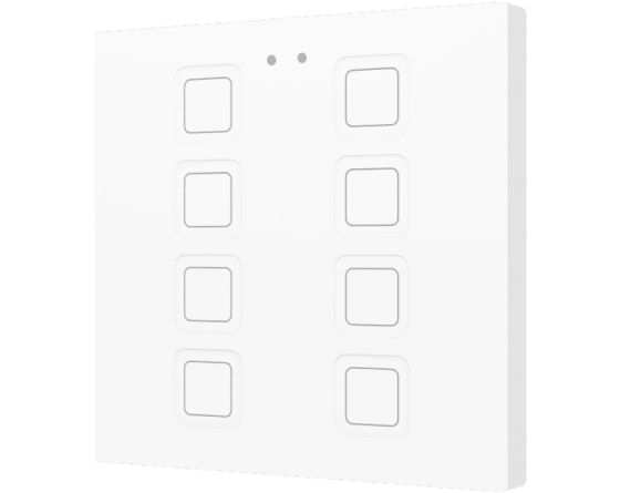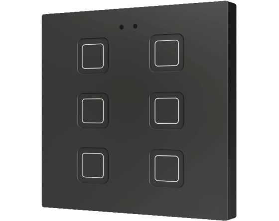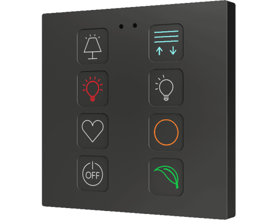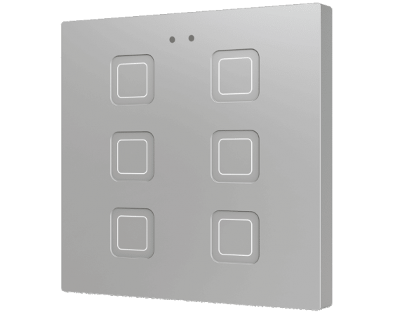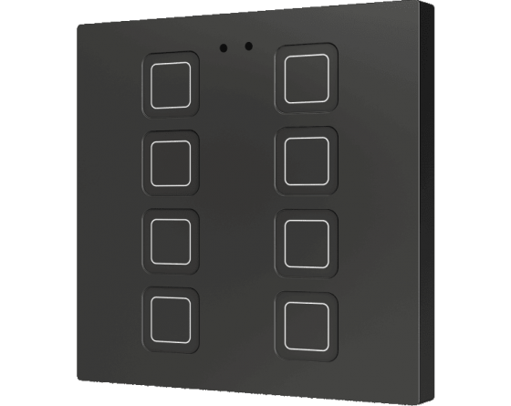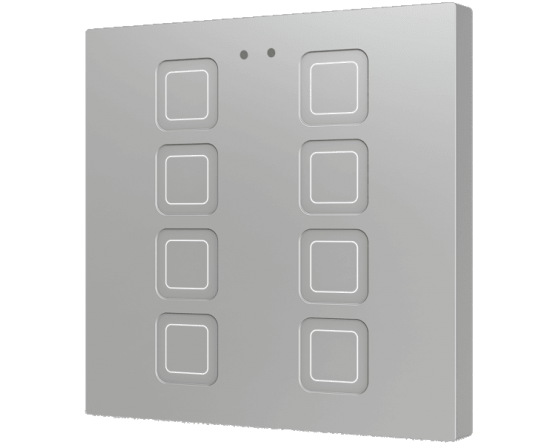 Interrupteurs capacitifs en polycarbonate avec des icônes rétro-éclairées en RGB personnalisables. Il existe des modèles avec 1, 2, 4, 6 et 8 boutons avec des fonctions configurables et des icônes rétro-éclairées en RGB, qui s’atténuent lorsque l’utilisateur n’est plus détecté par le capteur de proximité. Le Tecla RGB dispose d’une sonde interne de température et un thermostat, avec 2 entrées analogiques-numériques qui peuvent être configurées comme entrée binaire pour capteur ou bouton poussoir libre de potentiel, comme sonde de température ou détecteur de mouvement. Il est compatible avec KNX Secure.