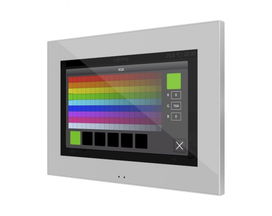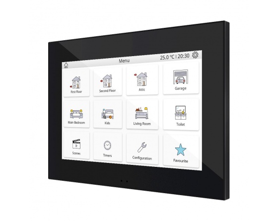 Écran tactile capacitif couleur de 7" pour un contrôle total de la maison connectée ou de la chambre d'hôtel, suivant une esthétique minimaliste. Le capteur de proximité permet de lancer un écran de veille lorsqu'il n'est pas utilisé et sa luminosité s'ajuste automatiquement, avec le capteur de luminosité inclus. Le Z70 v2 dispose d'une sonde interne de température, de deux thermostats et de 4 entrées analogiques/numériques. Il inclut un port USB et Ethernet pour le téléchargement du firmware. Installation en boîte d'encastrement européenne et anglaise standard double.